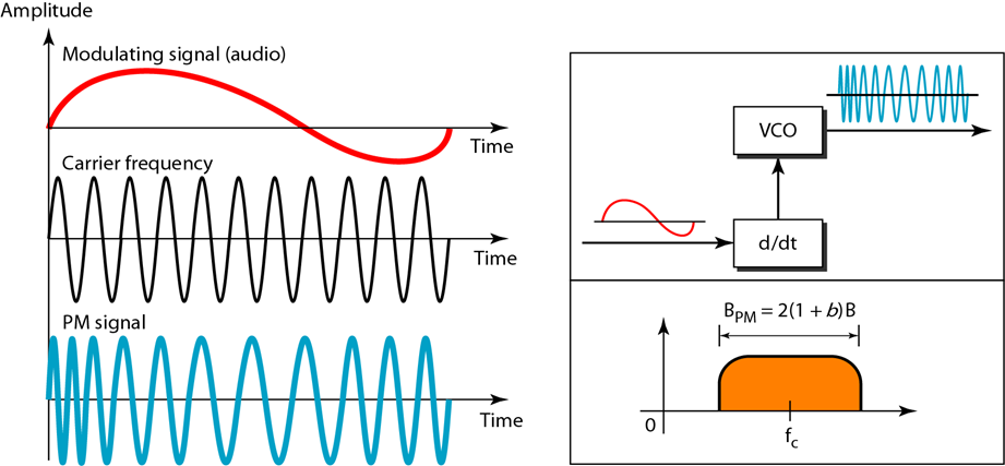 반송파 신호의 위상이 변조 신호의 전압 준위 변화에 따라 변조됩니다. 반송파의 최고 진폭과 주파수는 일정하게 유지되지만, 정보 신호의 진폭이 변화함에 따라 반송하의 위상이 비례하여 변화합니다.