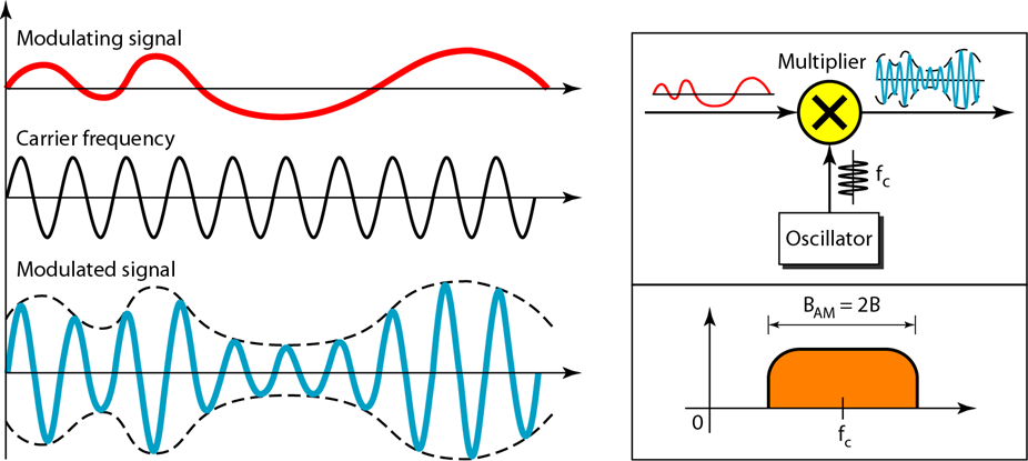 따라서 원본 아날로그 데이터의 주파수에 상관없이, 반송파의 주파수 대역으로 주파수 대역이 형행이동하게되는 것이고 이 방식은 AM이라고 합니다.