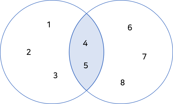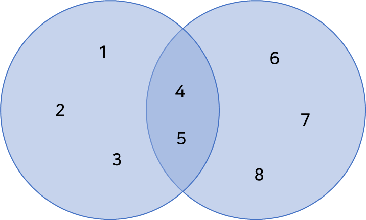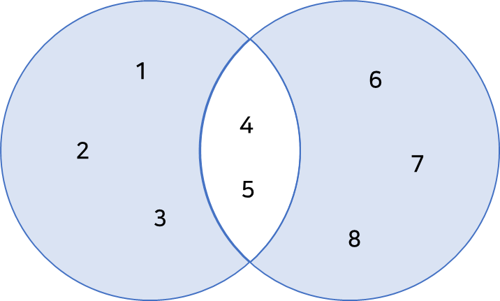 두 집합의 합 집합은 두 집합의 모든 요소를 포함하는 집합입니다. 이는 union() 메서드 또는 '|' 연산자를 사용하여 수행할 수 있습니다 아래 코드는 union()을 통해 두 집합을 합치는 코드입니다. 이 때 집합은 중복된 요소가 있을 수 없기 때문에 4,5가 한개씩 있는 것을 확인 할 수 있습니다.
